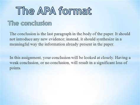 Apa Format Conclusion. General guidelines for referring to the works of others in your essay. In a general way, restate your topic and why it is important, restate your.