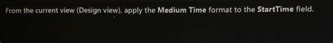 From the current view, which is the design view, you can apply the medium time format to the starttime. Web from the current view, which is the design view, you can apply the medium time format to the starttime field.